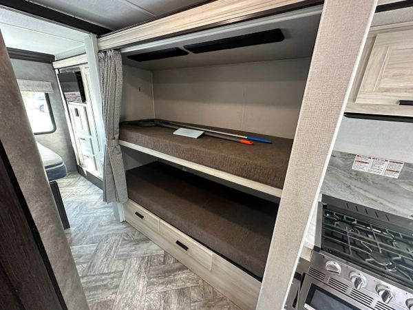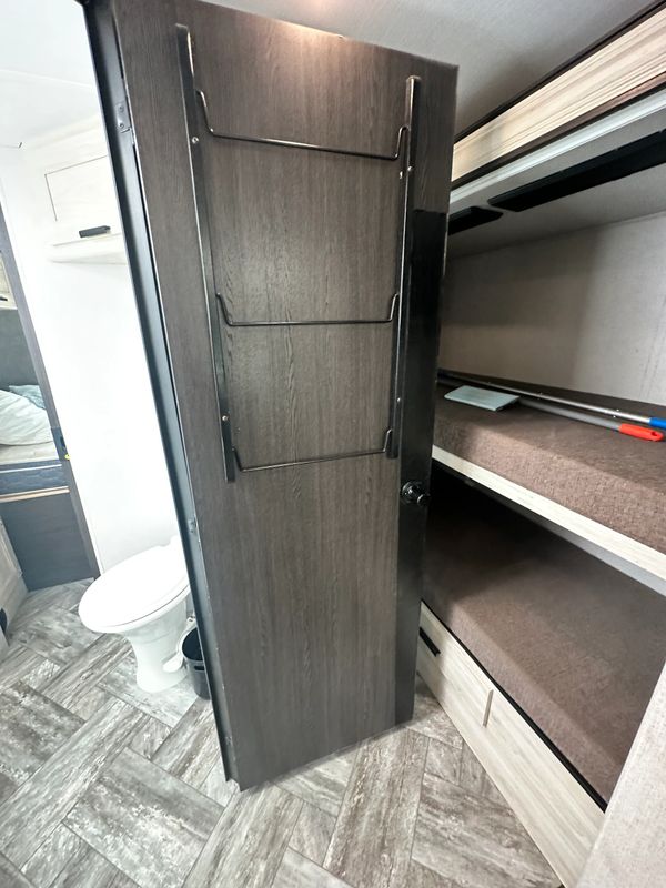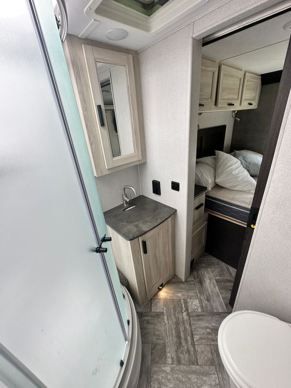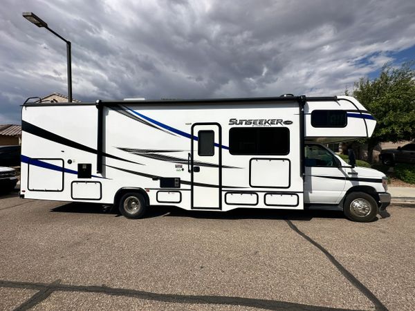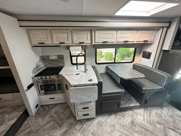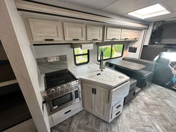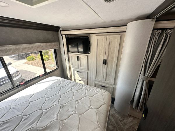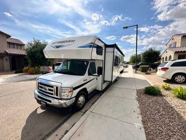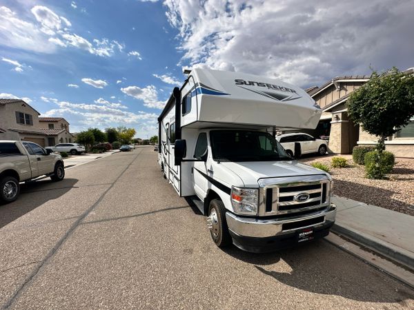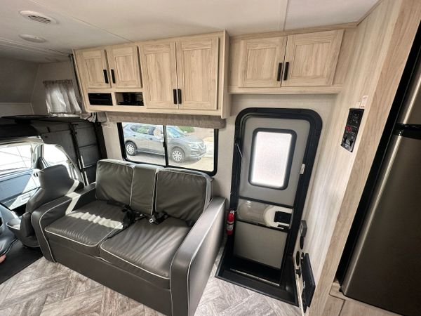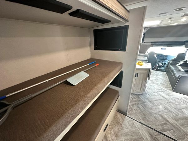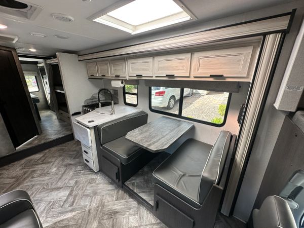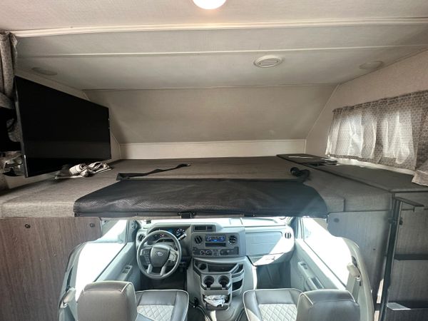 At 32ft long, this beautiful Class C RV has plenty of space to ensure you don't feel cramped at the campsite. It has 1 massive slide out on the driver side that really opens things up when you get to your destination. With 1 large bunk above the cab, 2 single bunks, rear queen bed, dinette and couch that both turn into beds, you can comfortably sleep up to 10 people!